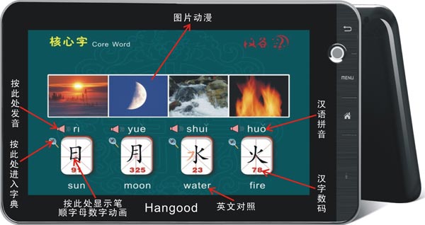 HanGood Electronic Dictionary recorded 6000 commonly used words, covering basic words of international Chinese teaching outline of NOCFI and primary school. Chinese Pinyin, Hanzi Digital, Chinese-English meaning can be searched by Hanzi Digit and Chinese Pinyin. Standard mandarin pronunciation, picture animation, stroke orders, letters and digitals animation demo can be obtained by touch & click. It only takes seconds searching Hanzi by this machine.