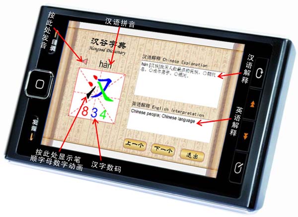 这是一款基于《汉谷》系列对外汉语教材的中文学习机。每个字词都配有英汉双解对照,都配有标准普通话发音,都配有笔顺、字母、数码的动画演示,还配有电子双解字典、电子双解词典辅助学习。