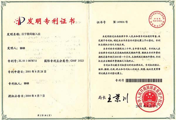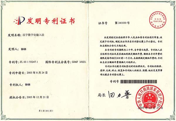 In April 2004 and December 2005, the company got patent certificate of Hanzi Digit & Digitalization from Intellectual Property Bureau. In December 2007, Virtual Economy & Data Technology R&D Center of Chinese Academy of Science engaged Prof. ZhongLin as part-time researcher. In the first session of eleventh National People’s Congress(NPC) on March 2008, 16 NPC Deputies jointly submitted a proposal to the standing committee of NPC, suggesting making Hanzi Digitalization Plan according the main body of Hanzi digital.